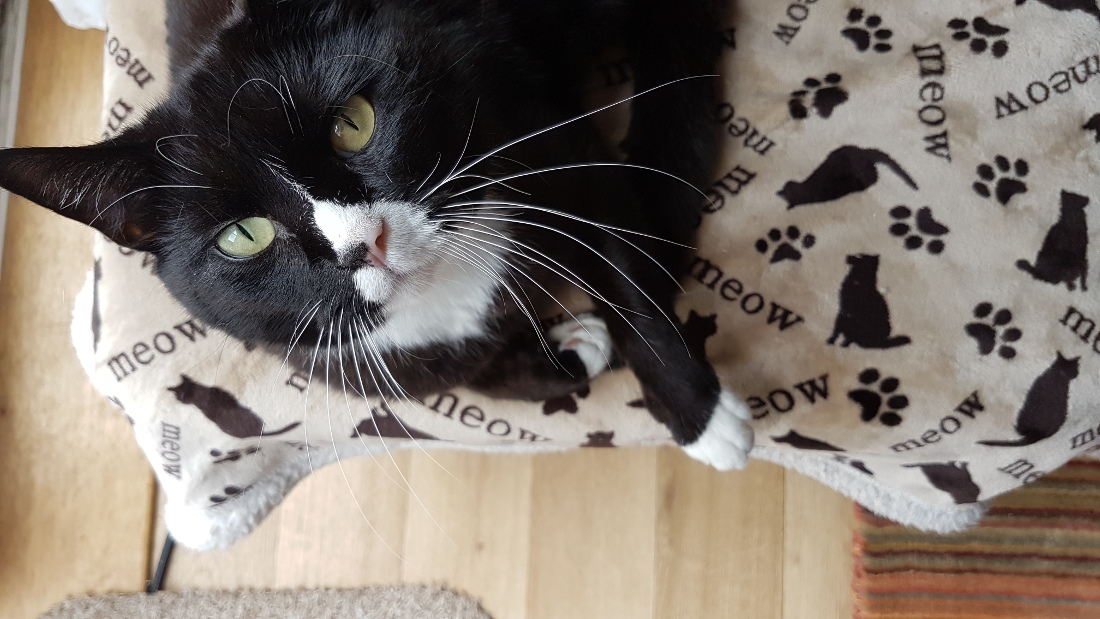 Now where do you start trying to explain this cat. He is also a rescue from Cats Protection and unfortunately lost one of his back legs in a R.T.A, but does it slow him down at all....no way! Of all the cats I have ever known he has the most character. He loves to play, eat, chat and scat around the house!