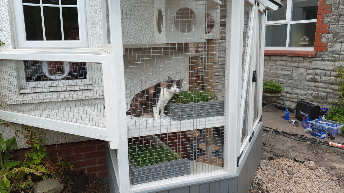 We put a lot of time into the fine detail of the build. Using high quality timber to create the structure and insetting individual pieces of mesh, rather than the standard technique of just wrapping mesh around the Catio and fixing it with staples. We also rounded every single edge of all the wood to create a softer appearance and also to make it safer for Smudge to rub up against if she so desired. Then it was all topped off with two fully roofed sections with tiles to match the rest of the buildings!