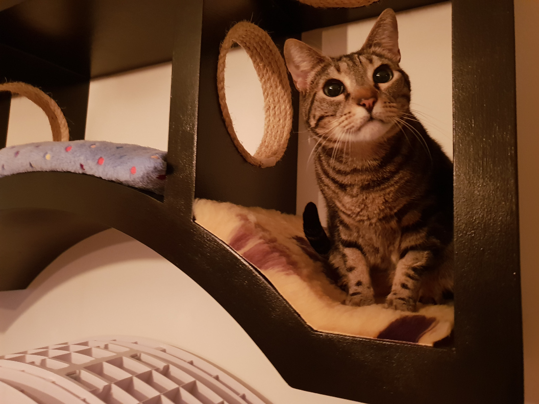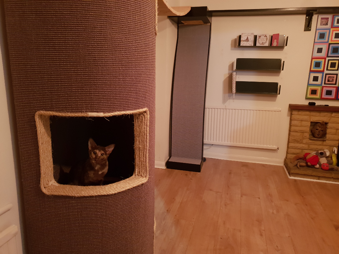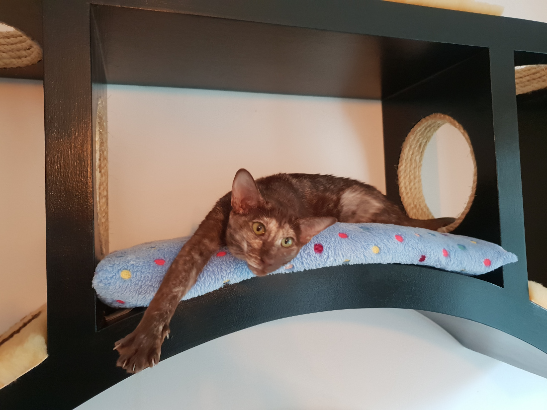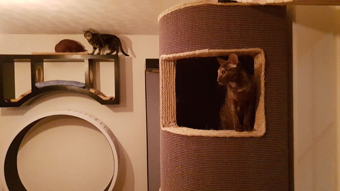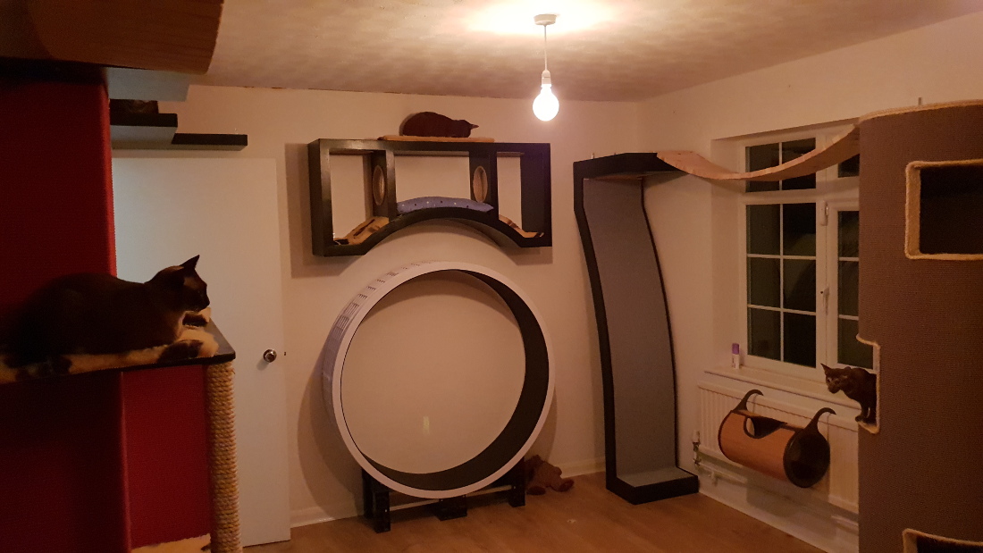 We also created yet another unique piece designed to be above the Cazami Cat Exercise Wheel. It turned out to be a favourite spot for napping after a long hard run :)