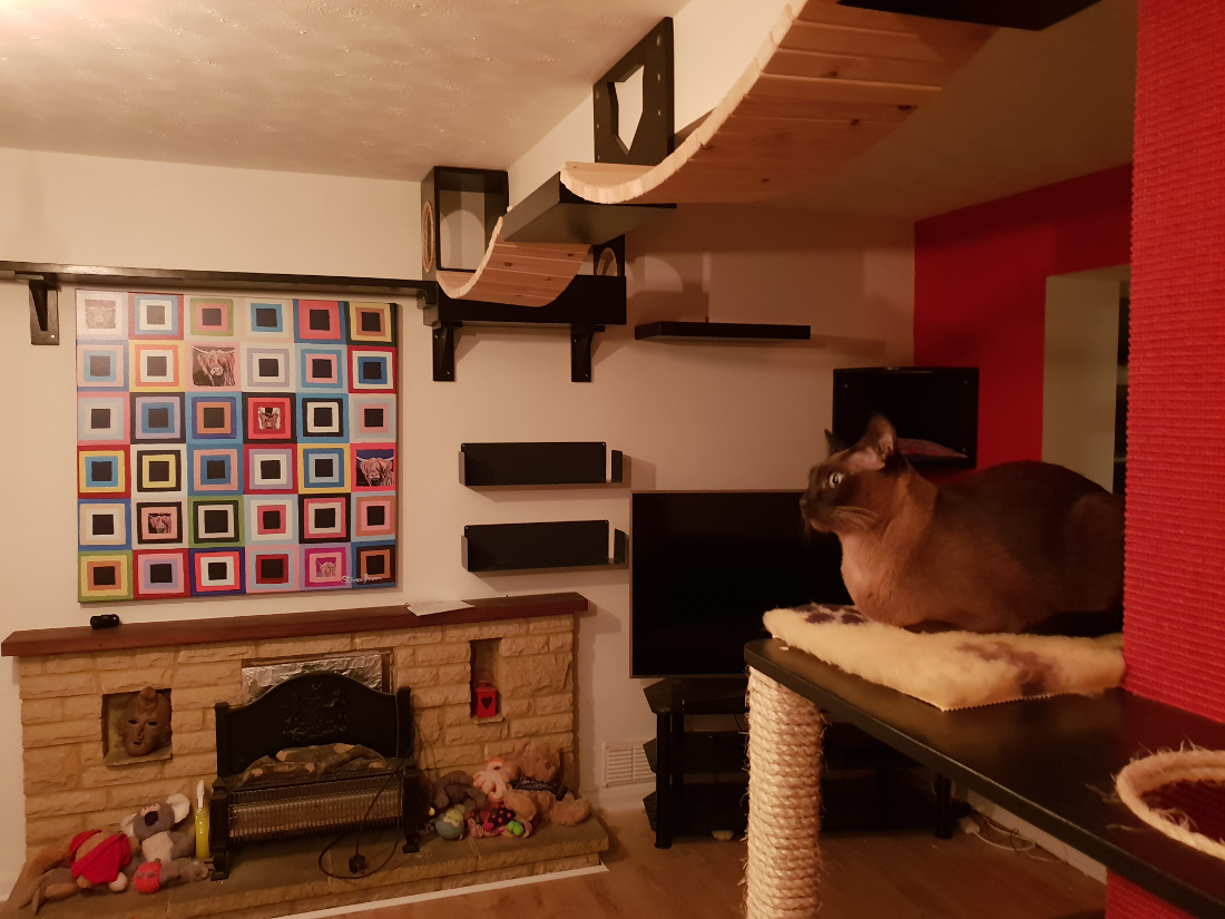 This piece was made to wrap around a corner with shelves and sisal sections for climbing, giving more access to the bridges working there way around the room.