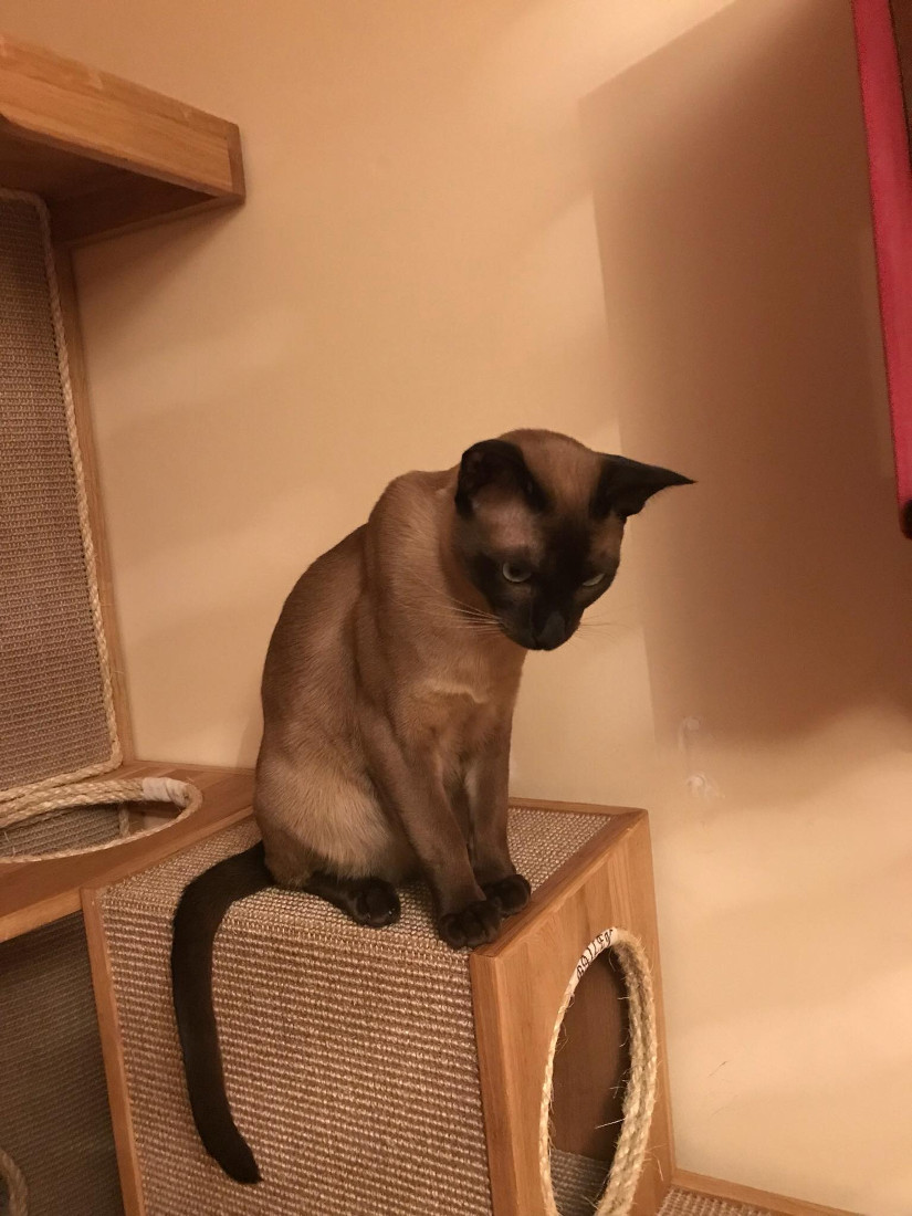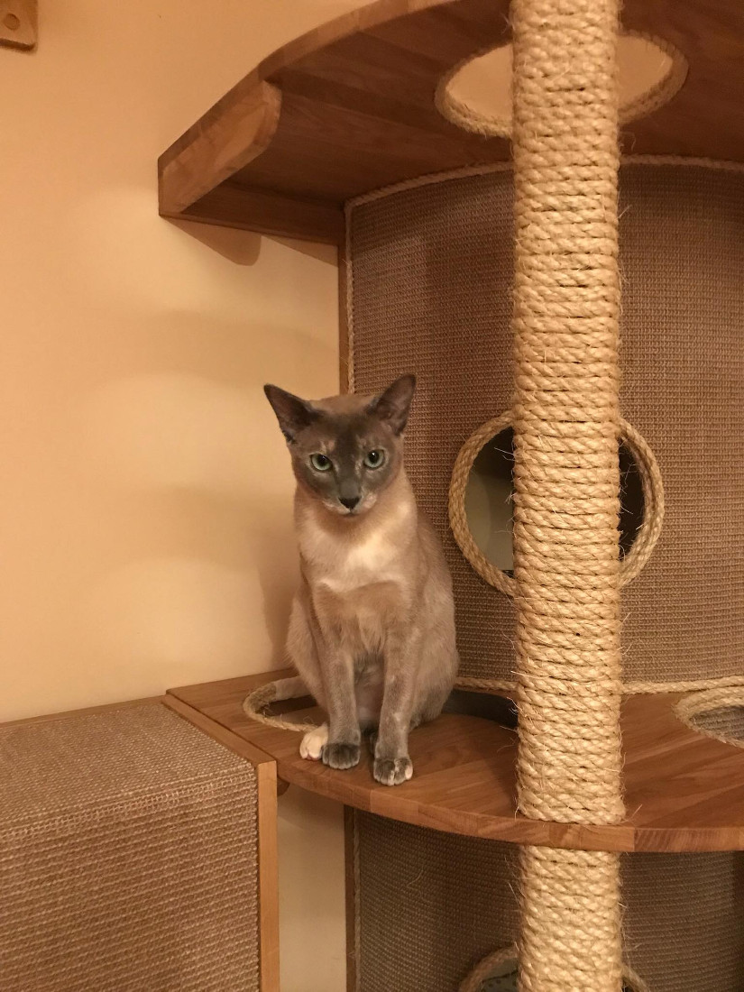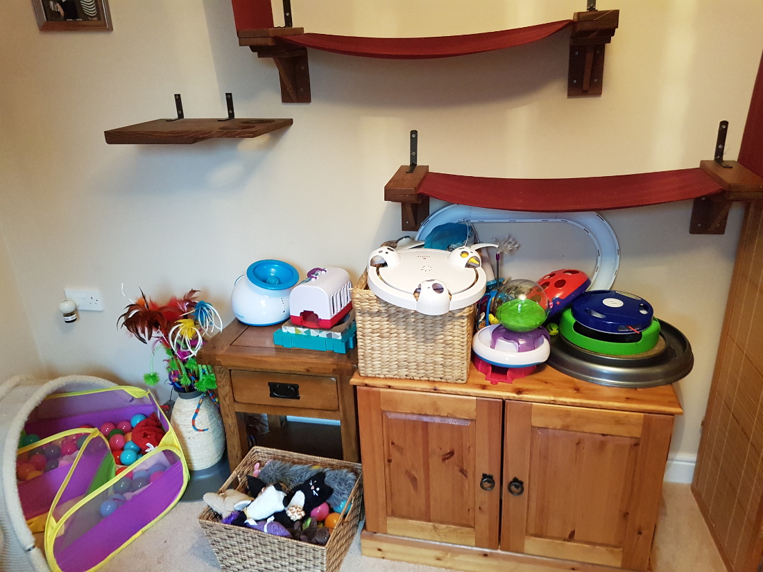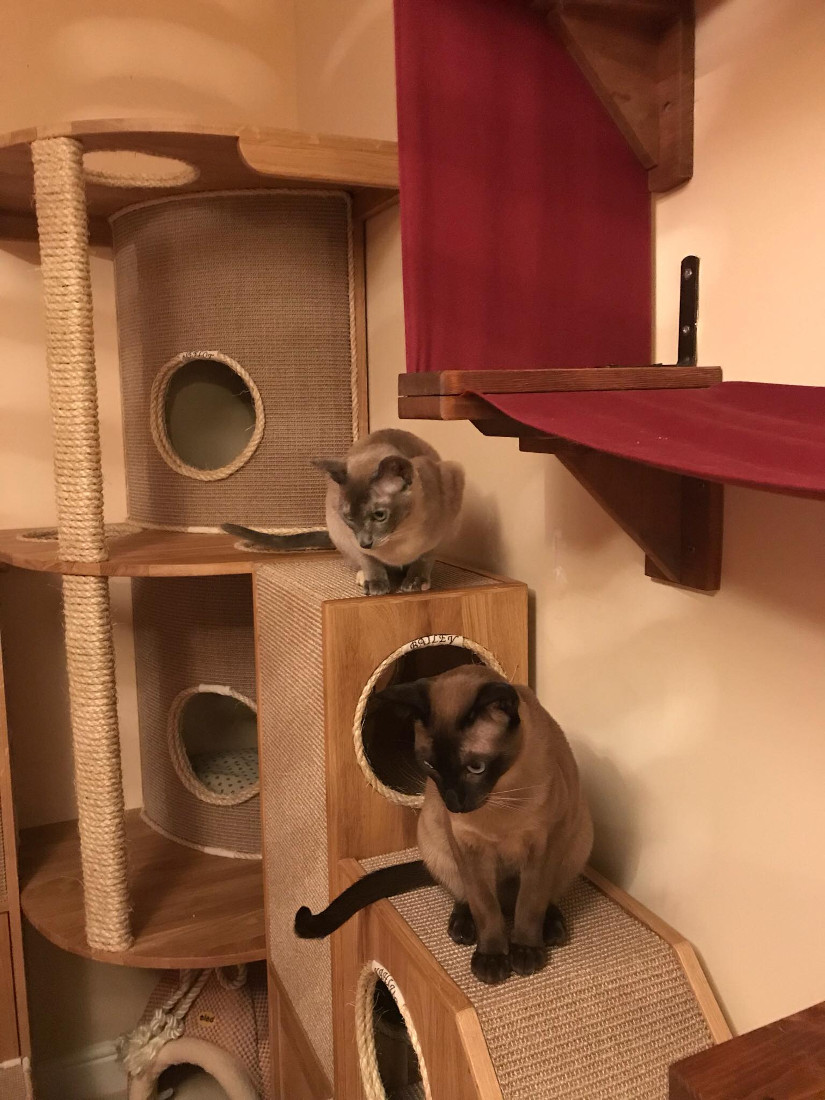 Nikki the owner of an adorable bunch of Tonkinese contacted us when she was looking for some custom built furniture for her cat room . The brief involved creating some interesting pieces for climbing and tunneling for the cats, but also something to help with organising all of the toys for the very active kitties. The cat room was already a stimulating environment for the cats with several pieces of cat friendly shelving and one of the excellent cat wheels from Cazami, but things just needed some streamlining!