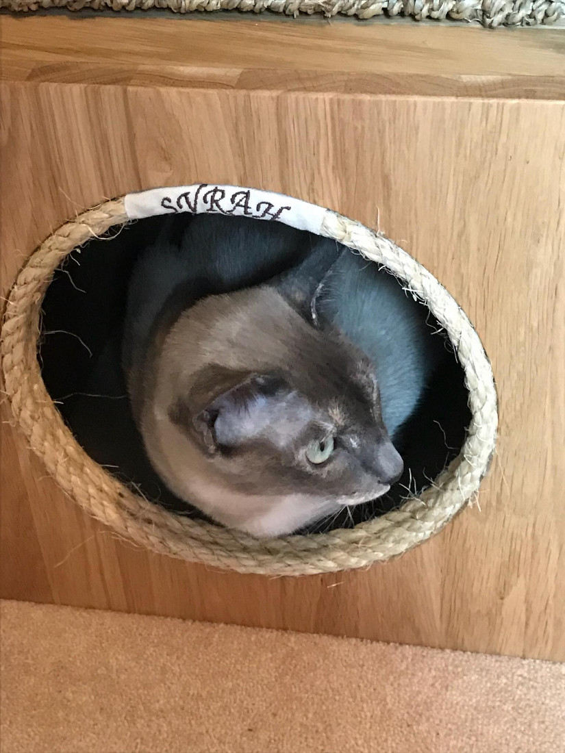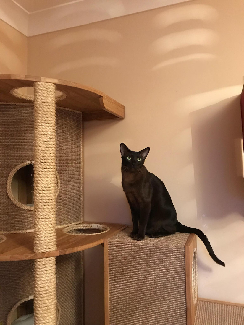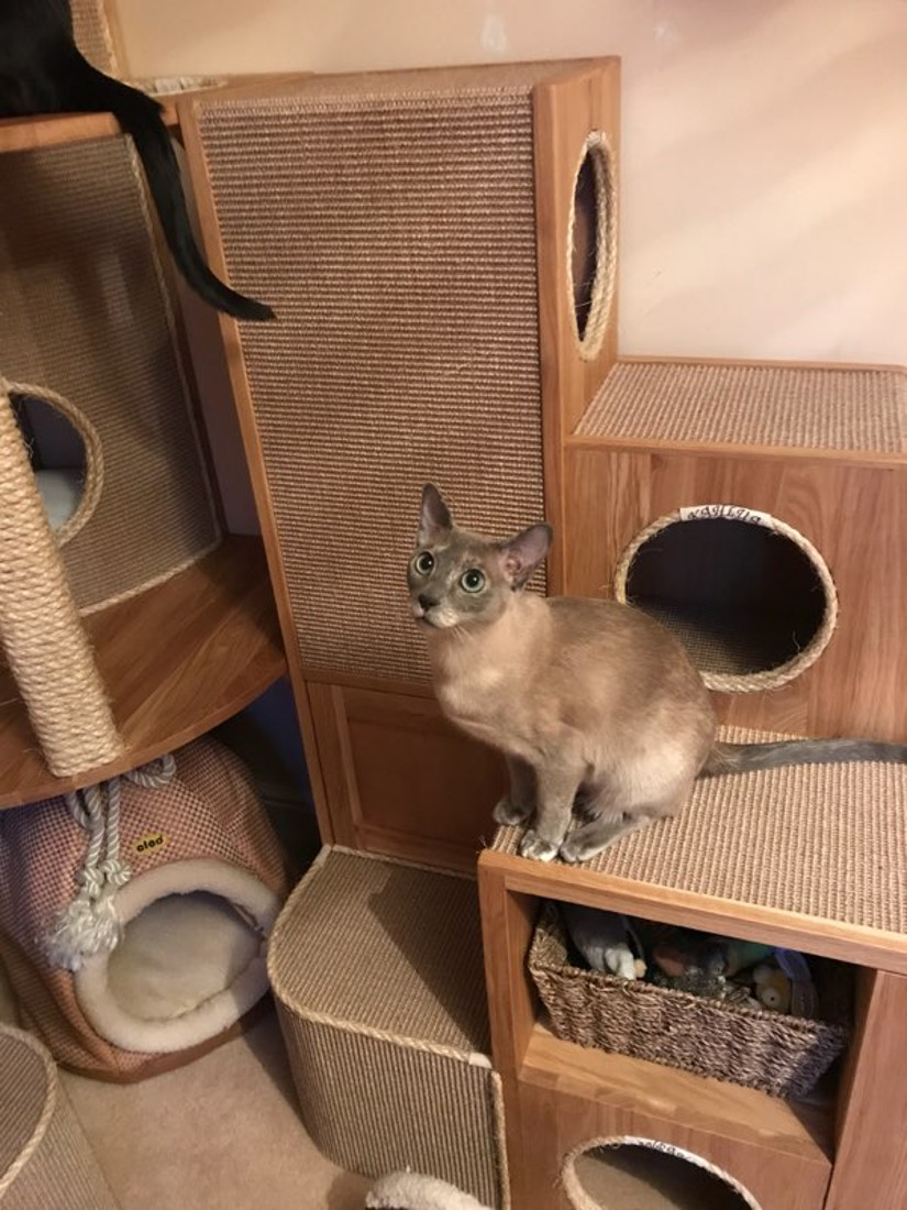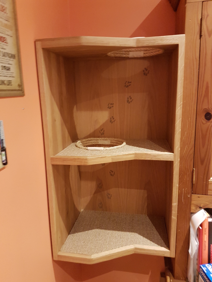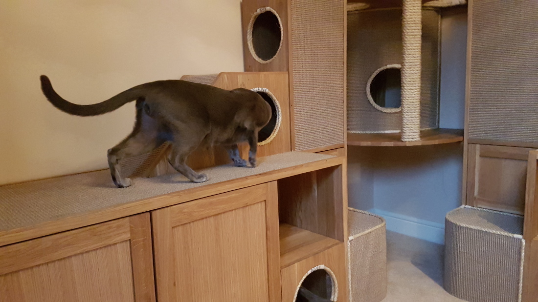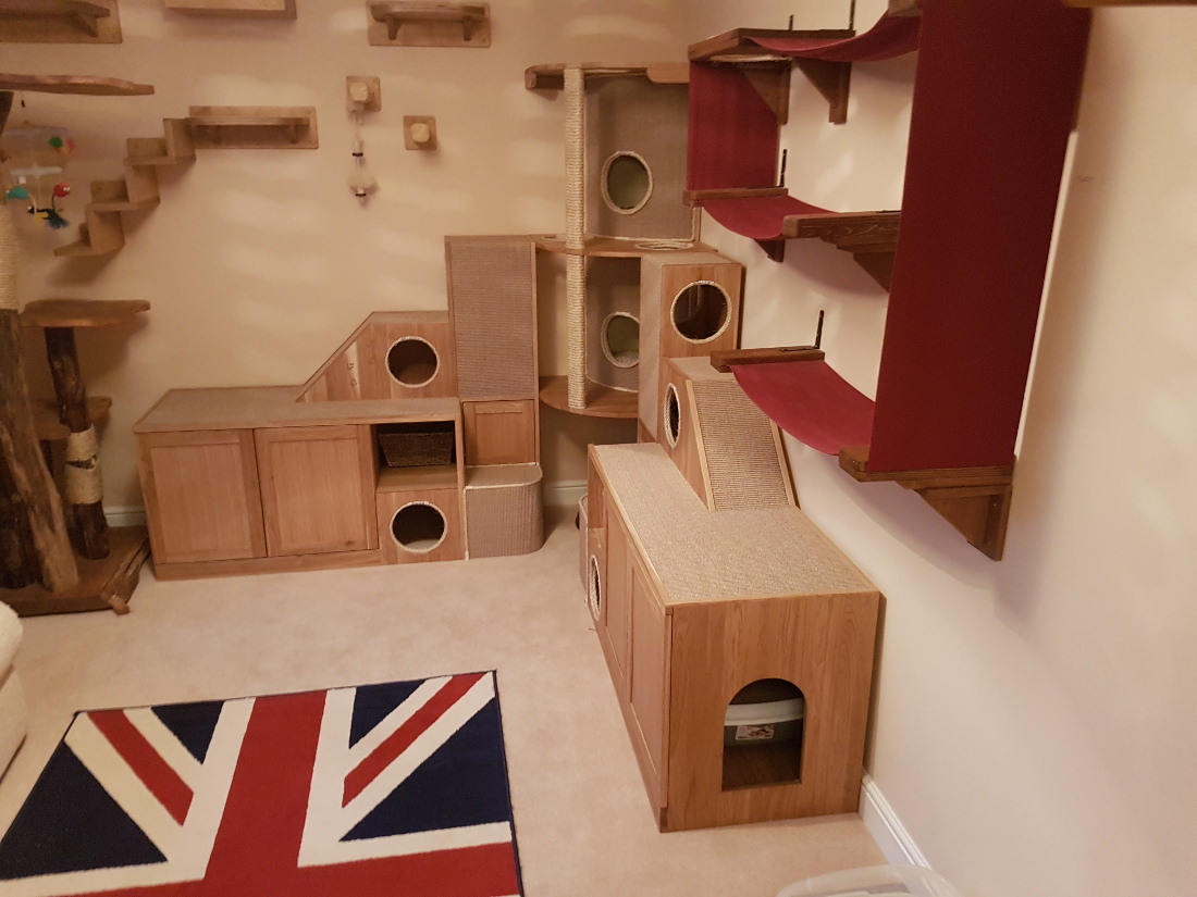The large custom built corner section was made from solid oak and contains multiple tunnels, a contained litter tray cupboard, a large storage cupboard with a special drawer for all of the feather toys, 2 smaller cupboards, 2 spaces with wicker basket storage, and a gigantic corner tower piece with 2 cubby hole beds.
