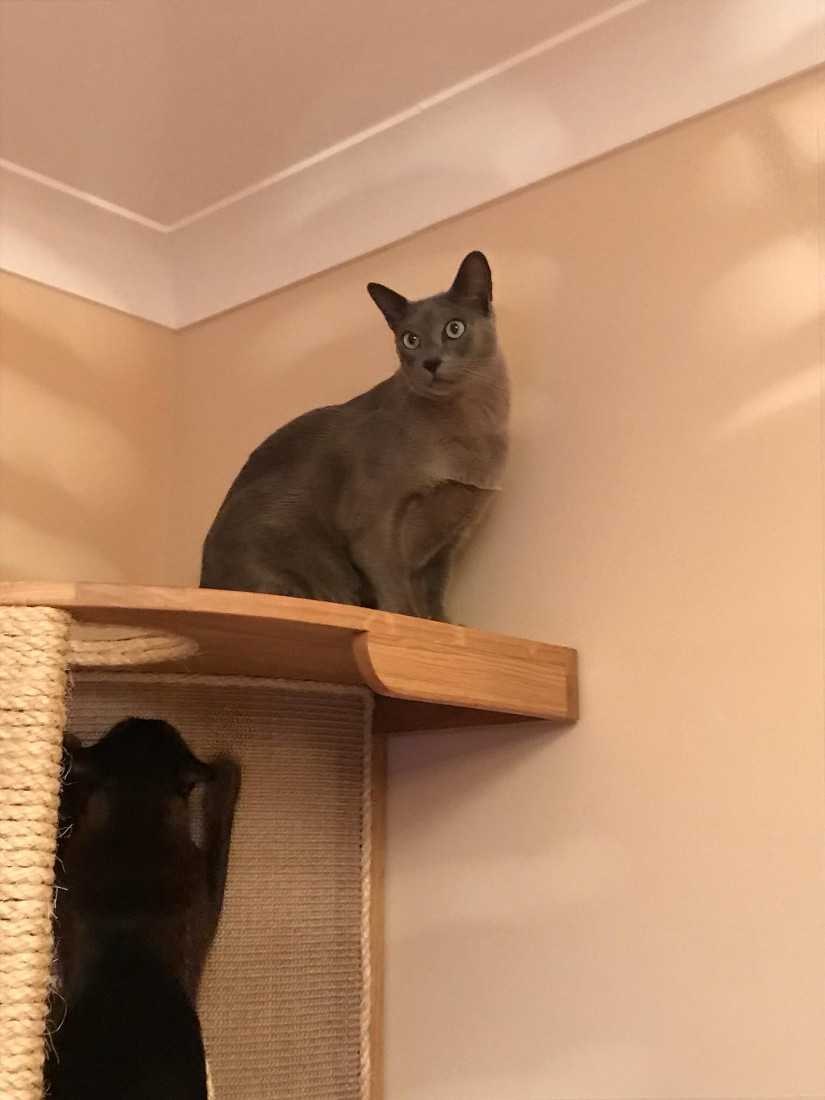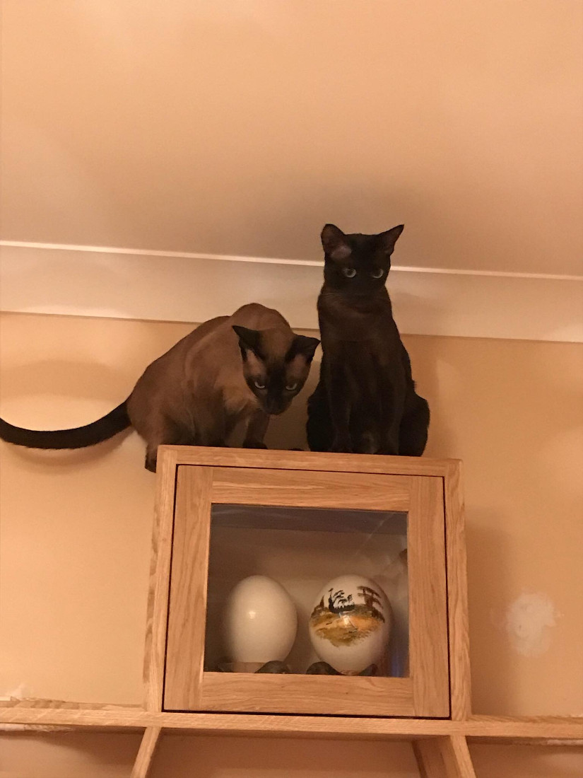 We also created a very special wall mounted custom piece to display a pair of ostrich eggs, that the cats could play on including a rope bridge. We then linked all the pieces around the room using some smaller shelves and a long one over the top of the door!