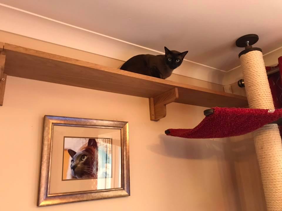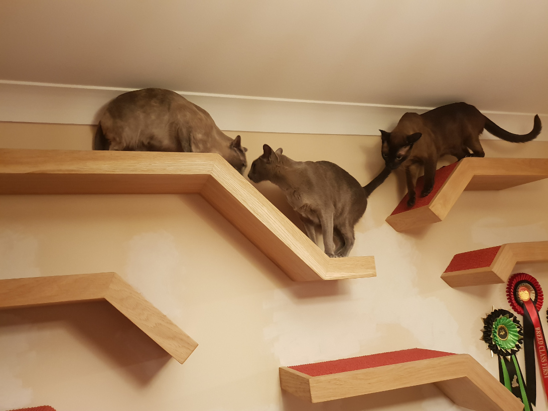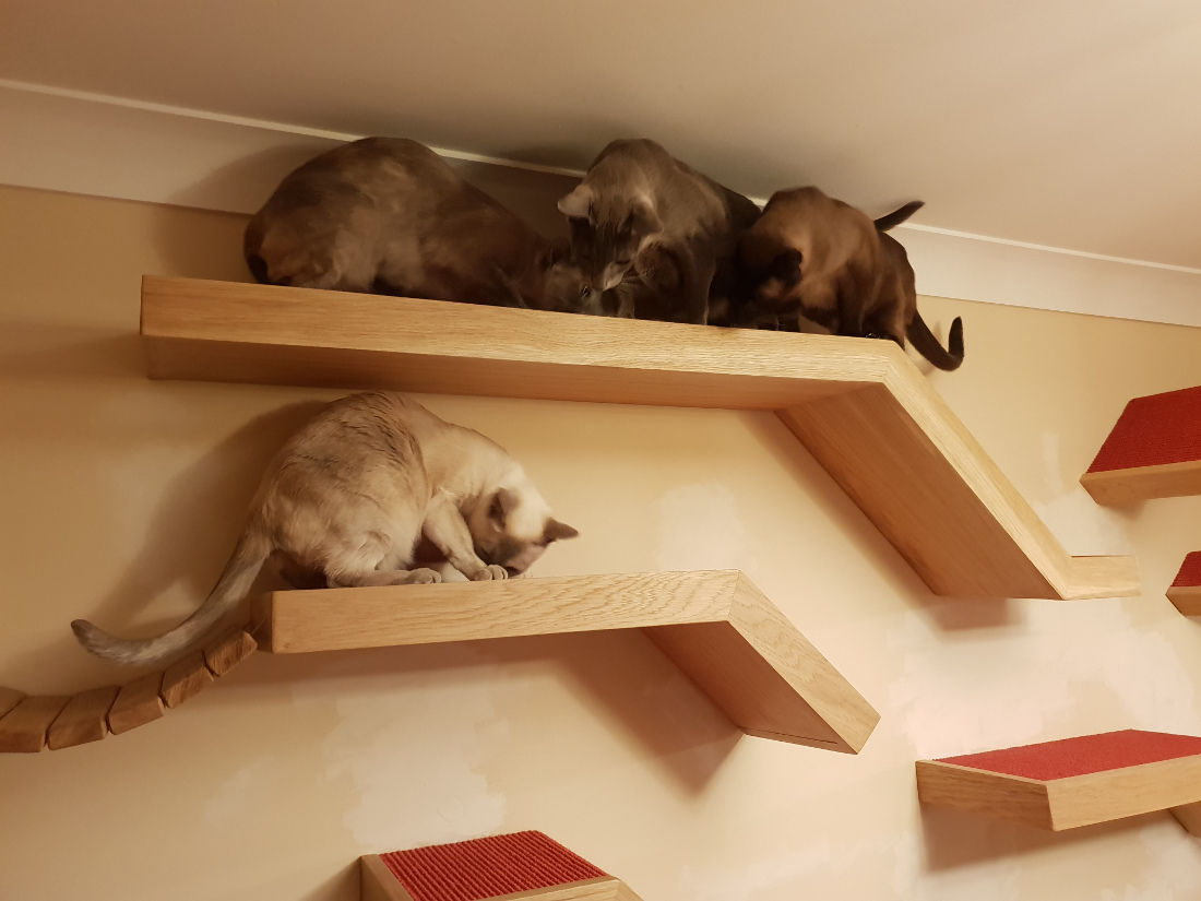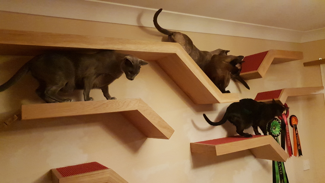 This time around we had to create a unique shelving layout to fit inbetweeen the existing dual purpose pieces already fitted to this room last year. These lucky Tonkinese now have a room full of stimulating exercise options and places to nap! The brief was to create something that would encourage jumping and running but also look interesting for their owner Nikki.